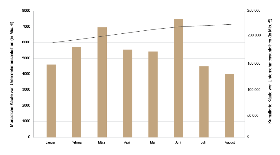 In Europa hat die EZB die Leitzinsen eingefroren, um die Renditen von Staatsanleihen der Mitgliedstaaten so niedrig wie möglich zu halten. Darüber hinaus hat sie ihr Anleihekaufprogramm („Quantitative Easing“ oder „Quantitative Lockerung“) vor allem auf Anleihen von Nicht-Finanz-Unternehmen ausgeweitet. In der Folge hält sie derzeit über 20 % der im Umlauf befindlichen Anleihen von Unternehmen, die für EZB-Investitionen in Frage kommen („Investment Grade“-Anleihen von Nicht-Finanz-Unternehmen im Euroraum).